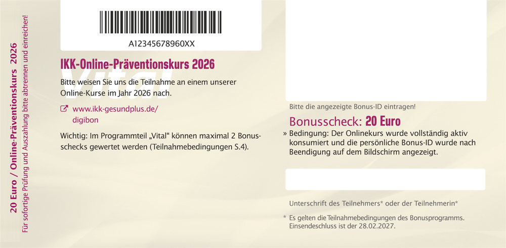 Nach Abschluss des 6-wöchigen Kurses erhalten Sie von Ihrem Nichtraucher-Coach Ihre persönliche Bonus-ID, welche Sie auf dem Bonusscheck "Nichtrauchen" eintragen.